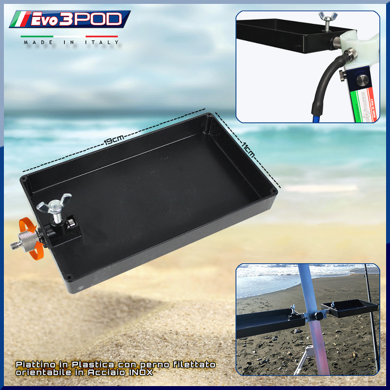 Tablette latérale plastique EVO3POD 19cm x11cm H 2cm plastique cette petite desserte peut être vissé sur la pique ou le trépied avec être appliqué latéralement sur ​​l'un des deux triangle fils de la Jolly supérieure ou à l'aide de la porte du triangle ref ETE09, ETE11 Avec son systeme de verrouillage rotatif en acier inoxydable qui tourne à l' intérieur de la Tablette, ce qui permet de la maintenir toujours a plat suivant l'angle de la Pique où du trépied.
